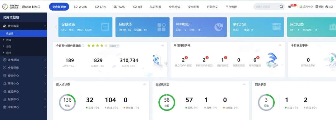信锐为埃克森新能源提供有线无线一体化的整体方案,利用一套平台(图一)实现了两套网络的统一管理,通过安全可视化的平台提高了整体网络的管控效率,网络运行状态看得更加清晰,故障主动告警,问题自动定位,使运维更简便。