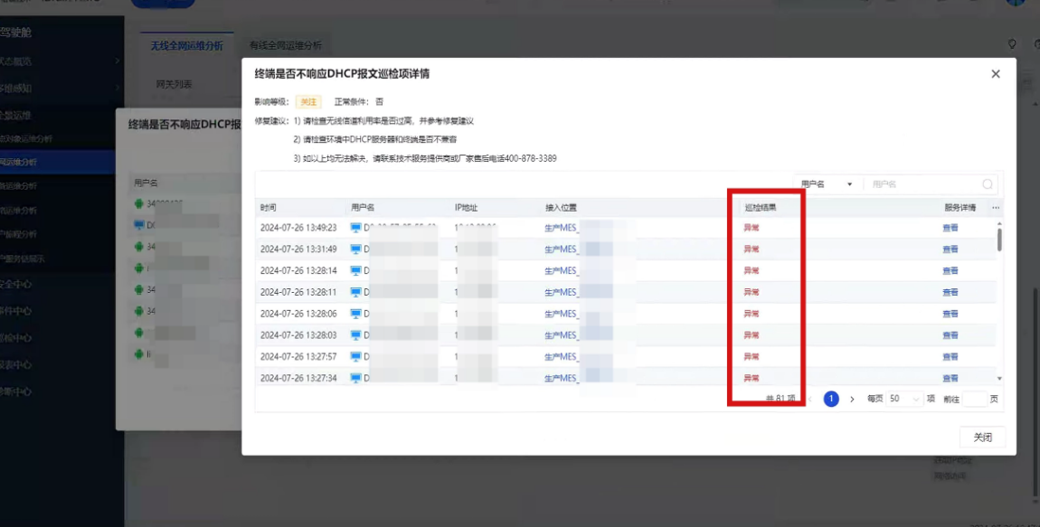 该用户已经开始用AI智能网络,工程师通过登录全网运维分析平台看到AI智能巡检已经发现了大量的终端提示巡检异常。