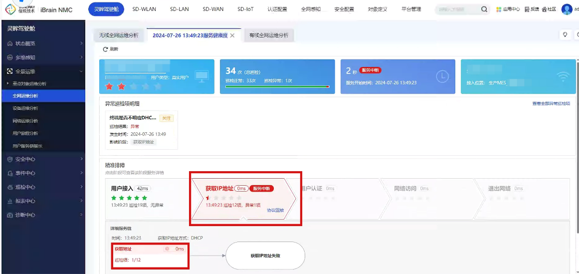 工程师通过点击某一个终端设备,查看了详细的信息,通过有序的排障指导看到该终端是在获取IP地址的阶段发生了故障。通过查看巡检异常项可以看到是终端获取不到DHCP地址导致连不上网络。