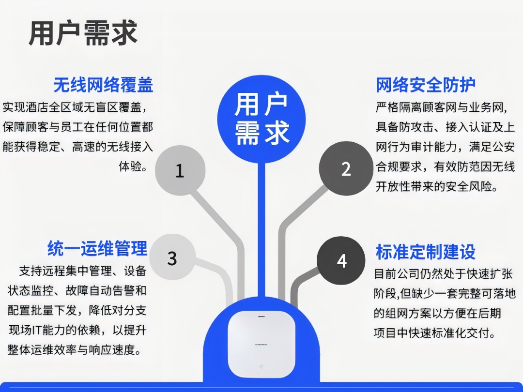 针对酒店行业面临的网络痛点问题,朗丽兹酒店对网络建设提出了如下需求: