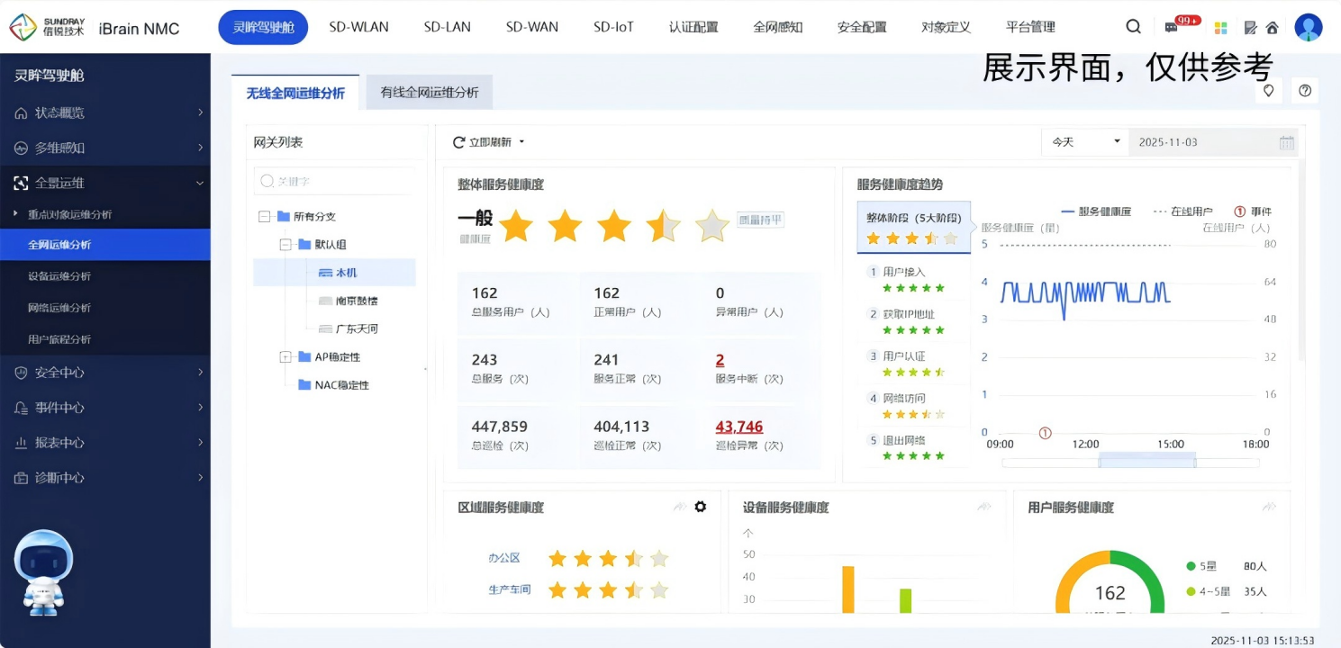 朗丽兹此次采用的是信锐多分支组网架构方案,不仅支持设备即插即用,大幅缩短上线周期;还可通过iBrain网络管理中心(图三),对总部及全国分支的设备进行集中管控。运维人员可以在可视化平台上实时监控、统一配置、快速排障,实现运维效率显著提升,有效减轻总部IT团队运维压力。