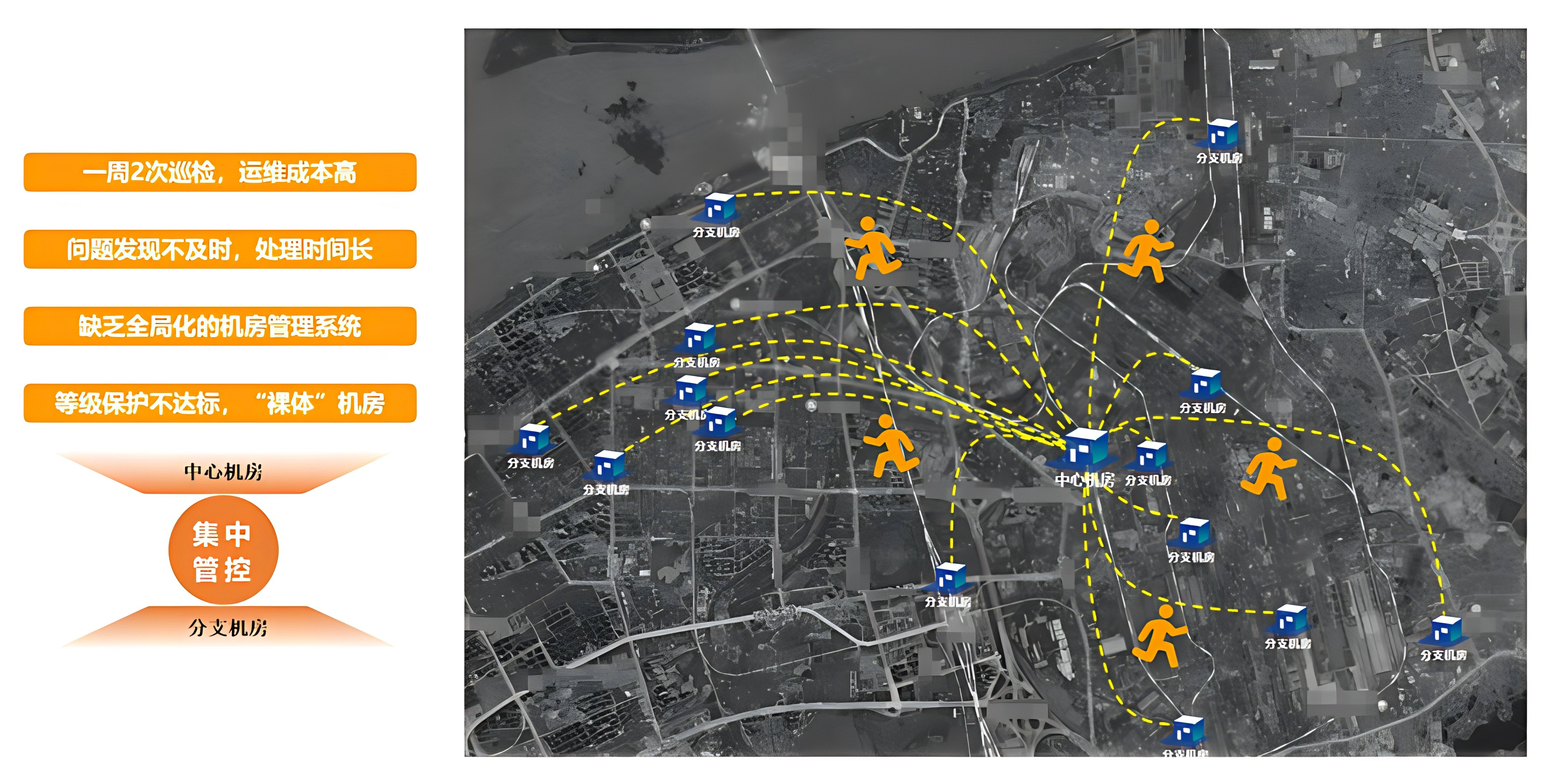 传统机房管理存在运维成本高、问题发现不及时、处理时间长、缺乏全局化管理系统、等级保护不达标等问题。以河南某用户为例,机房需要一周2次巡检,运维成本高昂;问题发现不及时,处理时间长;缺乏全局化的机房管理系统;等级保护不达标,成为“裸体”机房(图十三)。