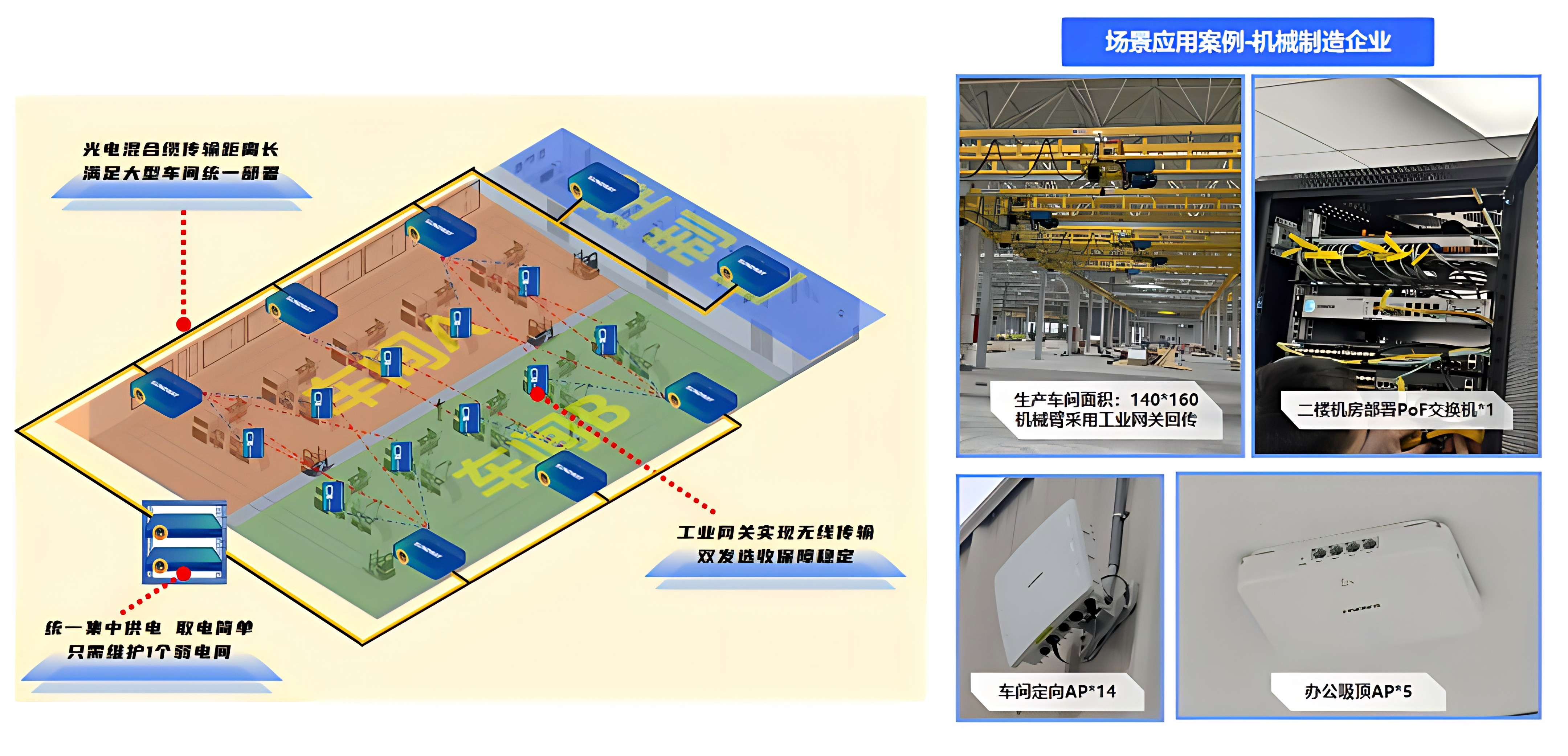 信锐采用新一代全光无线架构,核心交换通过100G链路连接网络控制器,支持MES、WMS等业务系统。在机械制造企业场景中,生产车间面积140×160平方米(图四),信锐方案通过二楼机房部署PoF交换机,通过光电混合缆长距离技术优势,直接为车间和办公的无线AP进行集中供电和通讯传输,完成无线局域网建设。