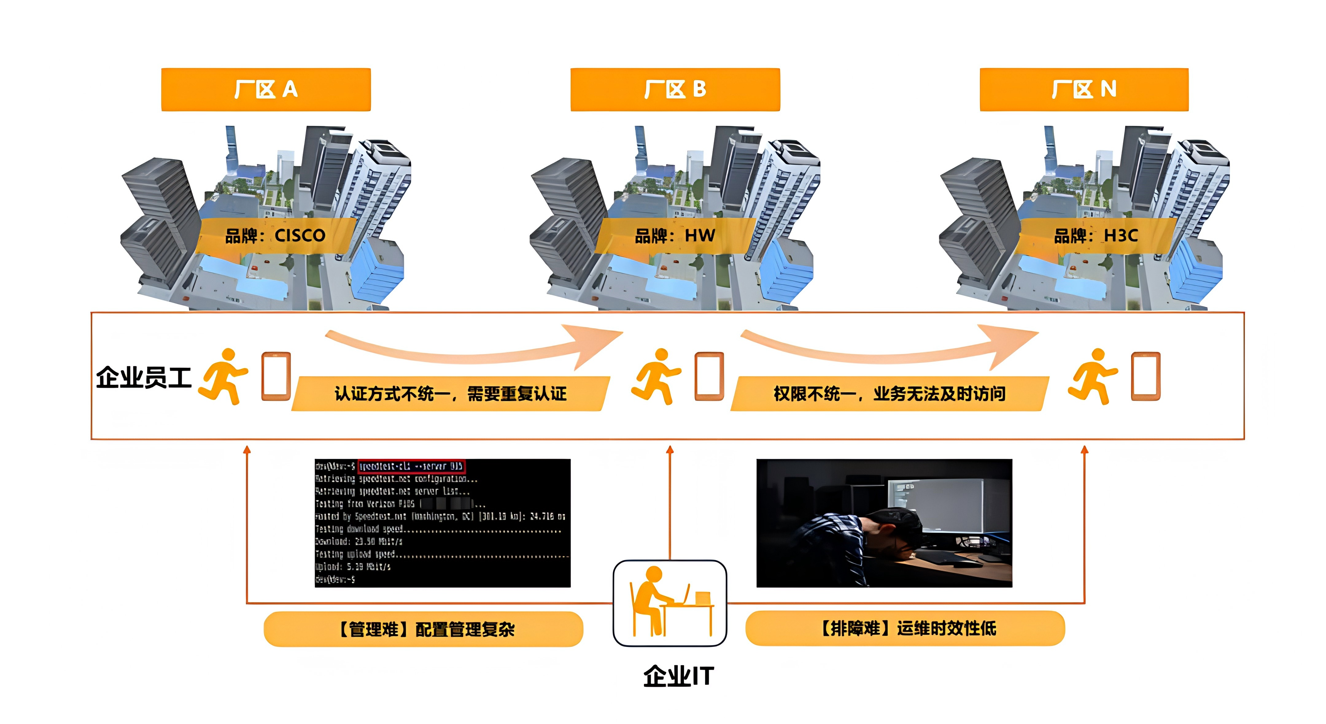 制造企业多分支网络面临统一管理难题(图九)。以广州某企业为例,不同厂区采用不同品牌的网络设备,导致认证方式不统一,员工需要重复认证;权限不统一,业务无法及时访问;配置管理复杂,运维时效性低。