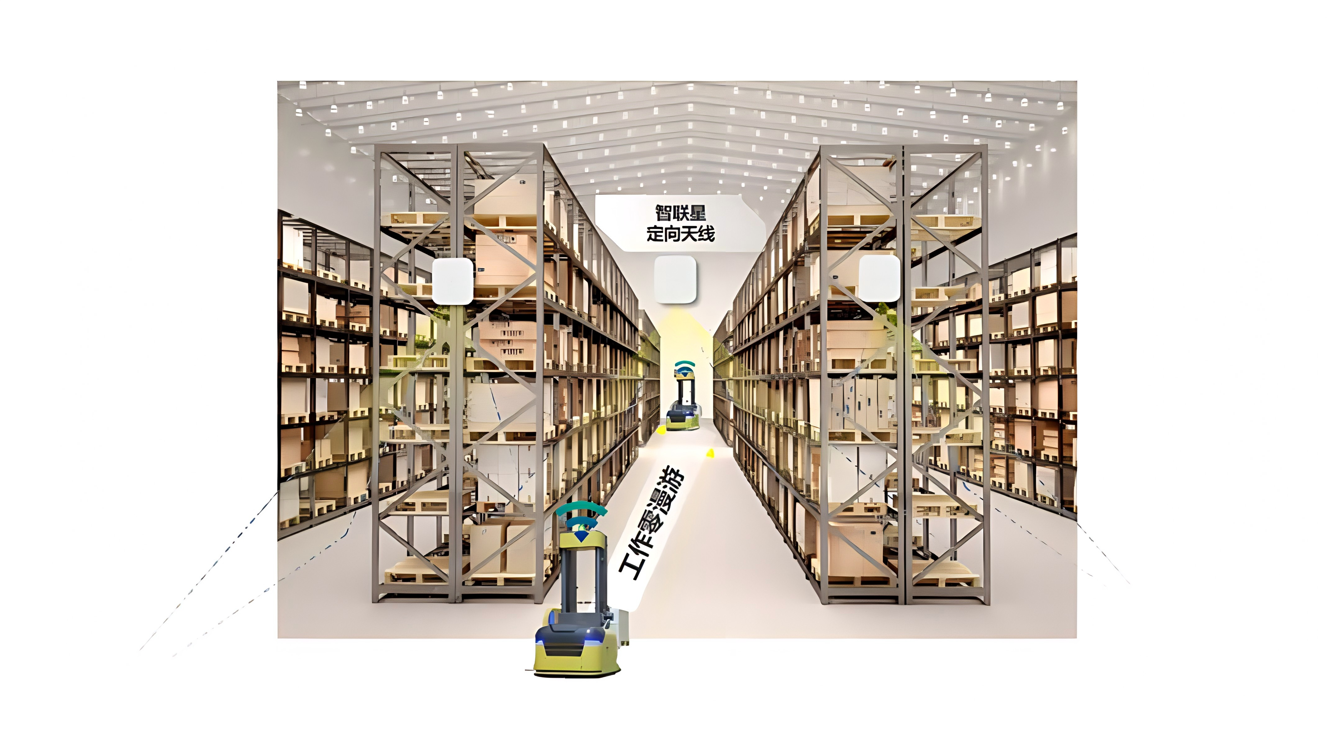 信锐智联星解决方案(图六)打造AB双面无线网,该方案支持64个点位零漫游无死角的无线覆盖,有效解决了仓储环境中的漫游问题,为AGV小车、无人叉车、PDA等移动设备提供稳定可靠的网络连接,确保仓储作业连续性和效率,为智能仓储建设提供可靠的网络保障。