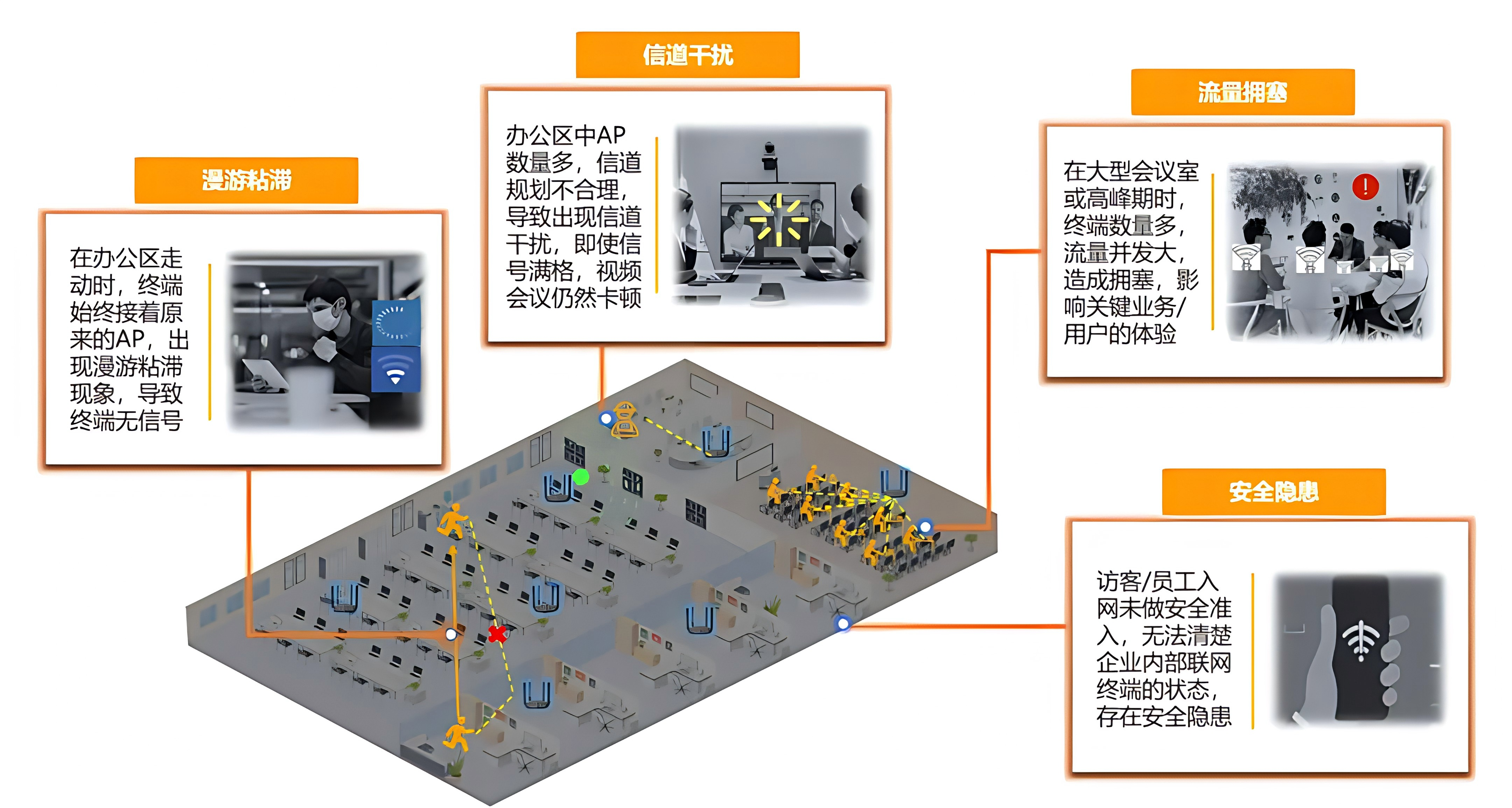 现代办公网络面临四大挑战:信道干扰、漫游粘滞、流量拥塞、安全隐患(图七)。以深圳某用户为例,办公区AP数量多,信道规划不合理,导致即使信号满格,视频会议仍然卡顿;员工在办公区走动时出现漫游粘滞,终端无法及时切换到最优AP;高峰期终端数量多,流量并发大,造成拥塞;访客员工入网缺乏安全准入,存在安全隐患。