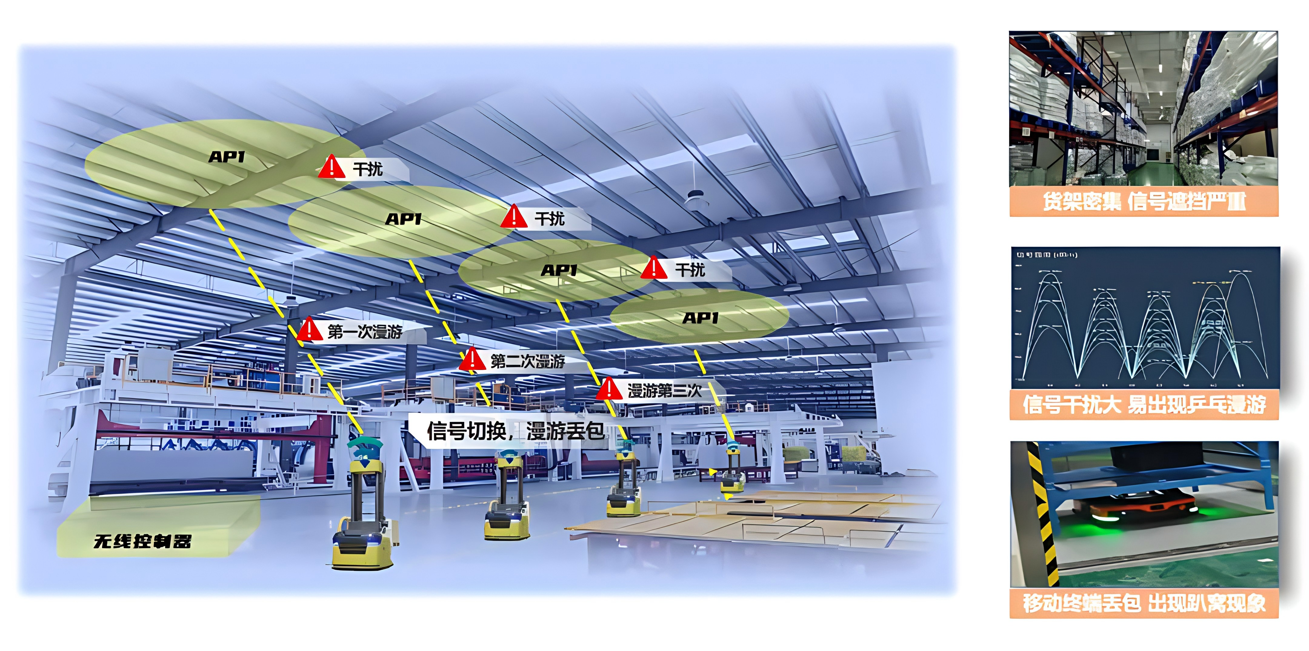 仓储环境网络覆盖面临特殊挑战(图五)。以浙江某客户为例,仓储区域货架密集,信号遮挡严重,易出现乒乓漫游现象;移动终端在移动过程中频繁出现漫游丢包,设备在信号切换时出现卡顿现象,严重影响仓储作业效率。