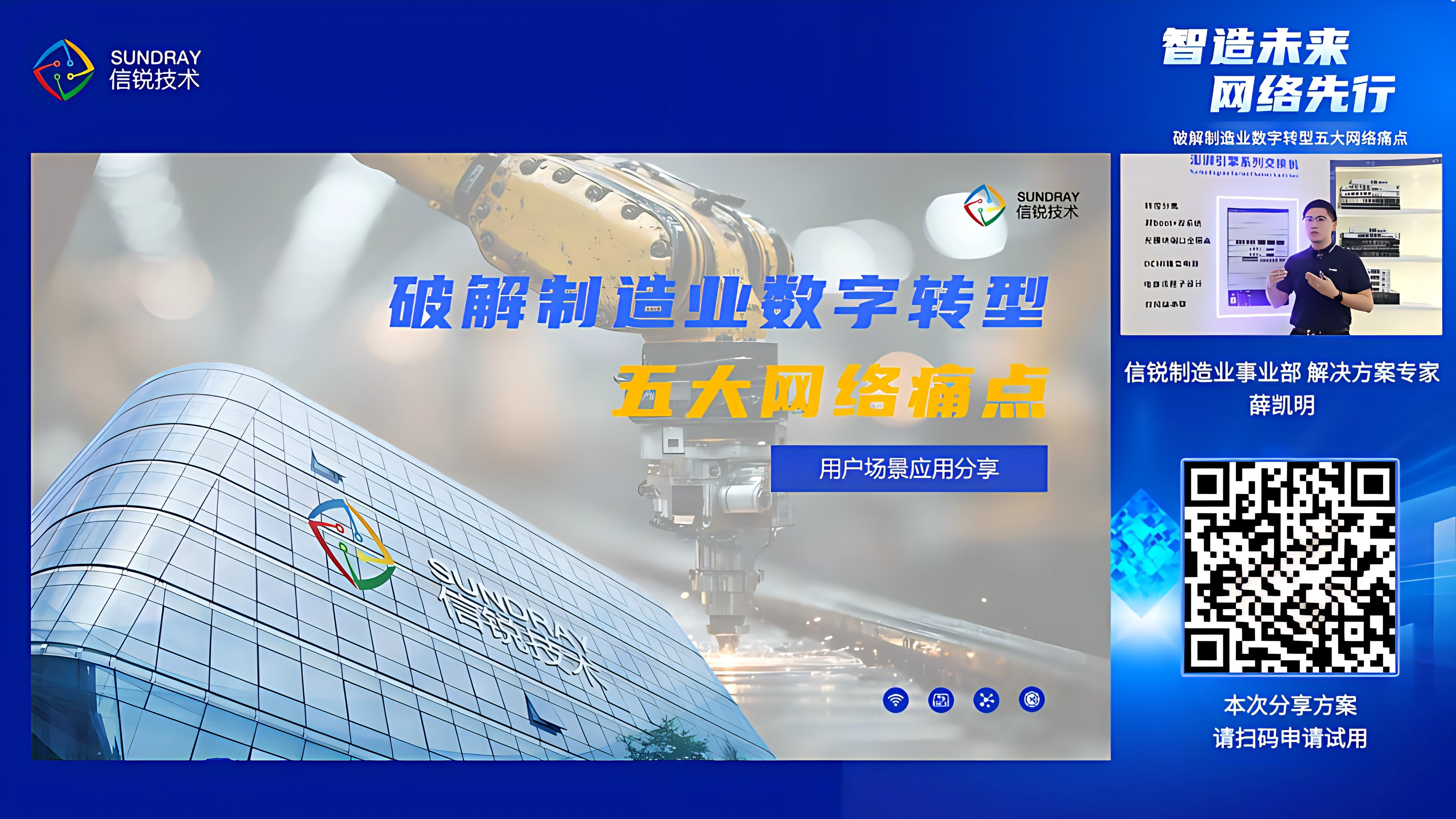 11月13日,信锐成功举办“破解制造业数字转型五大网络痛点”主题直播。本次直播深度聚焦制造业在园区、生产、仓储、办公、分支五大场景下面临的网络挑战,全面展示了信锐“五网双联”创新解决方案。