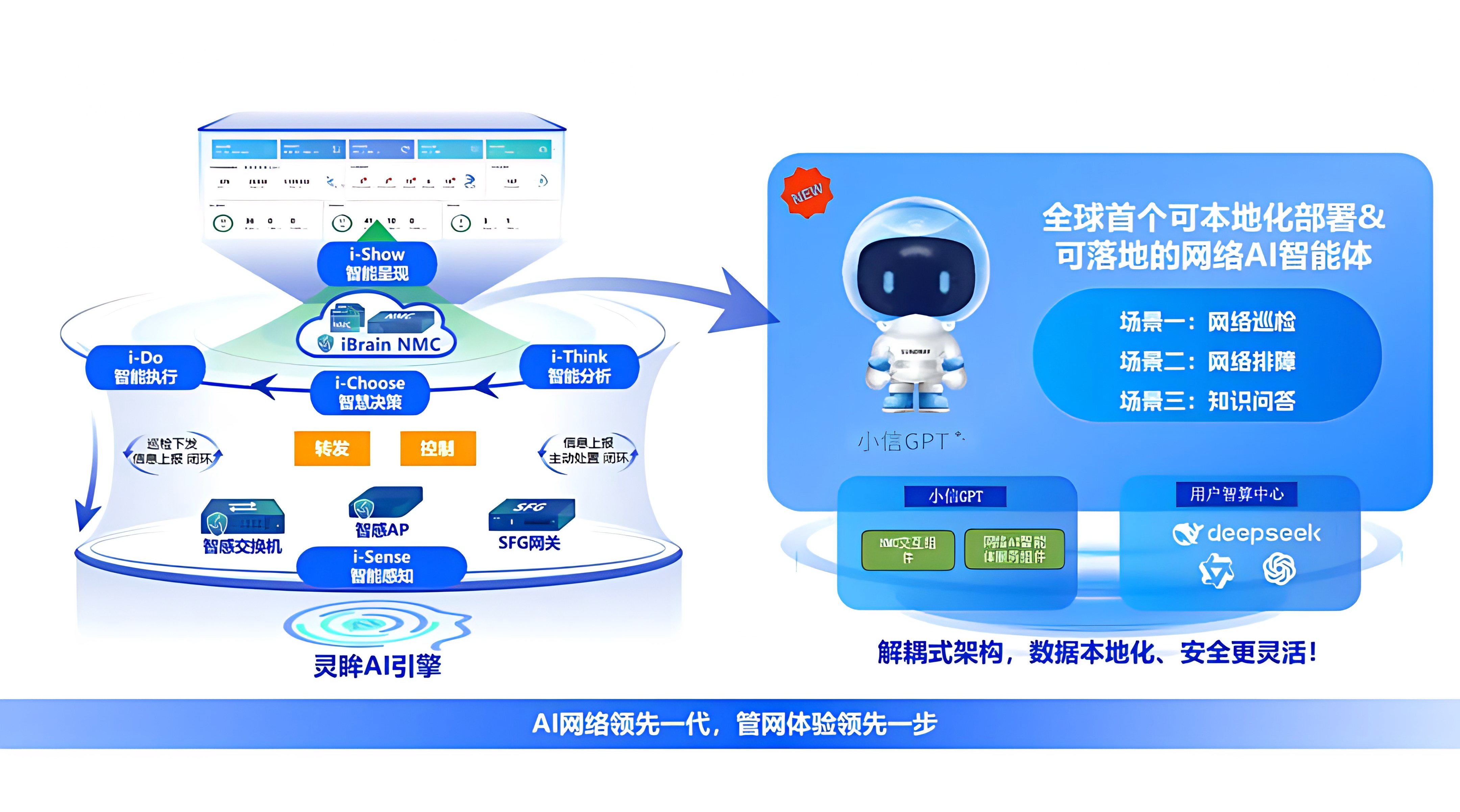 为应对上述挑战,信锐推出AI-Security全网智能解决方案,并创新引入全球首个支持本地化部署的网络AI智能体——小信GPT(图二)。该智能体具备网络巡检、智能排障与知识问答三大核心能力,基于解耦式架构实现数据完全本地化处理,在提升运维自动化水平的同时,全面保障数据安全与部署灵活性。